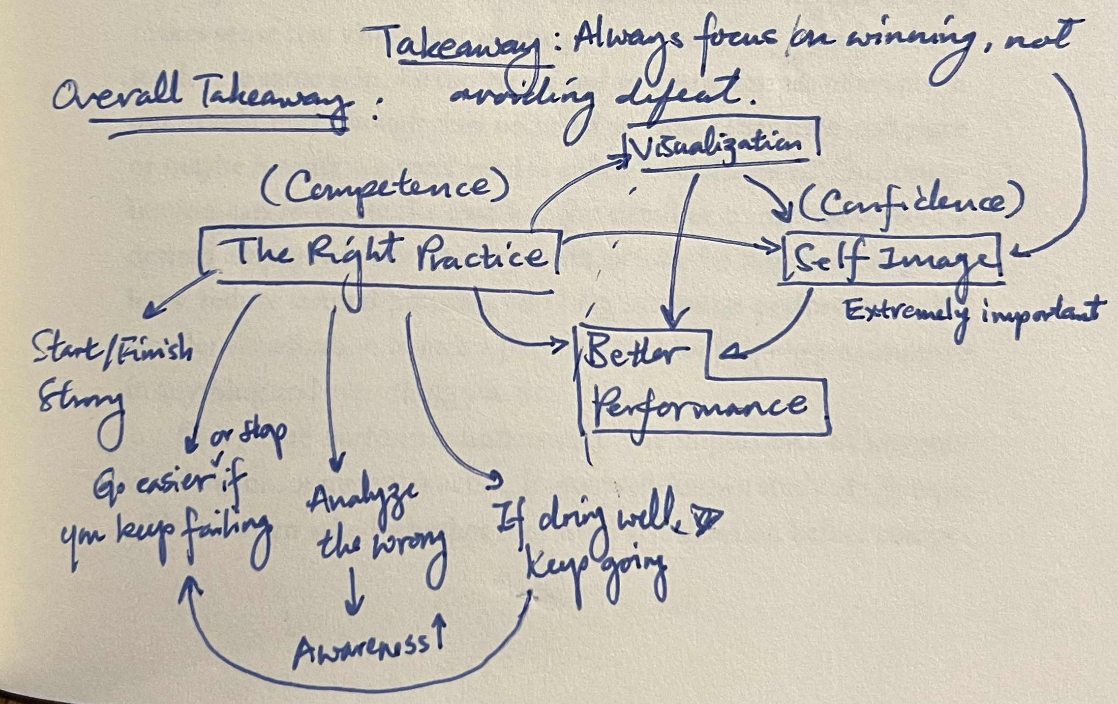 This is my summary of Minervini’s concepts: good practice plus visualization leads to better self-image and performance, which then feeds back into self-image. To the mind, visualization IS practice, except you can fully control the conditions, contingencies, and outcomes.